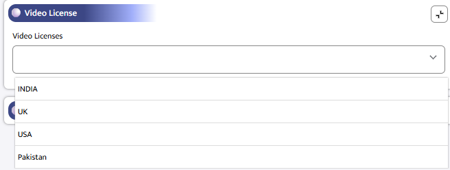 The Video License section allows you to manage licensing restrictions for your content. You can primarily restrict access by country, ensuring that only users in selected regions can view the content.Key Features:- Country Restrictions — Select the countries where the content is allowed or blocked.